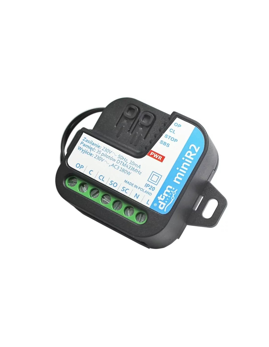 MINIR2 to sterownik przeznaczony do współpracy z napędami rolet, wyposażonymi w silnik jednofazowy 230V AC. Umożliwia zarówno zdalne jak i ręczne sterowanie pracą siłownika rolety. Kompaktowa obudowa pozwala na montaż w puszkach instalacyjnych.
