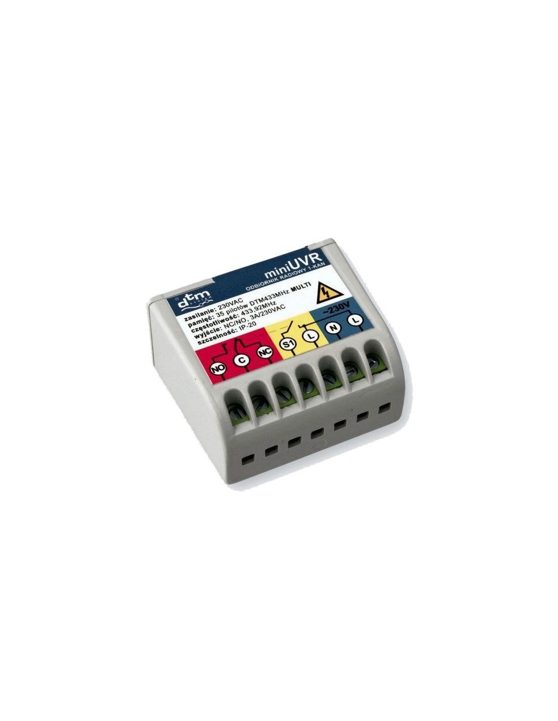 Kompaktowy, jednokanałowy odbiornik radiowy, przeznaczony do współpracy z urządzeniami zasilanymi napięciem 230V AC. Znajdzie zastosowanie w zdalnym i ręcznym sterowaniu automatyką domową, bramową, oświetleniem, wentylacją, itp.-